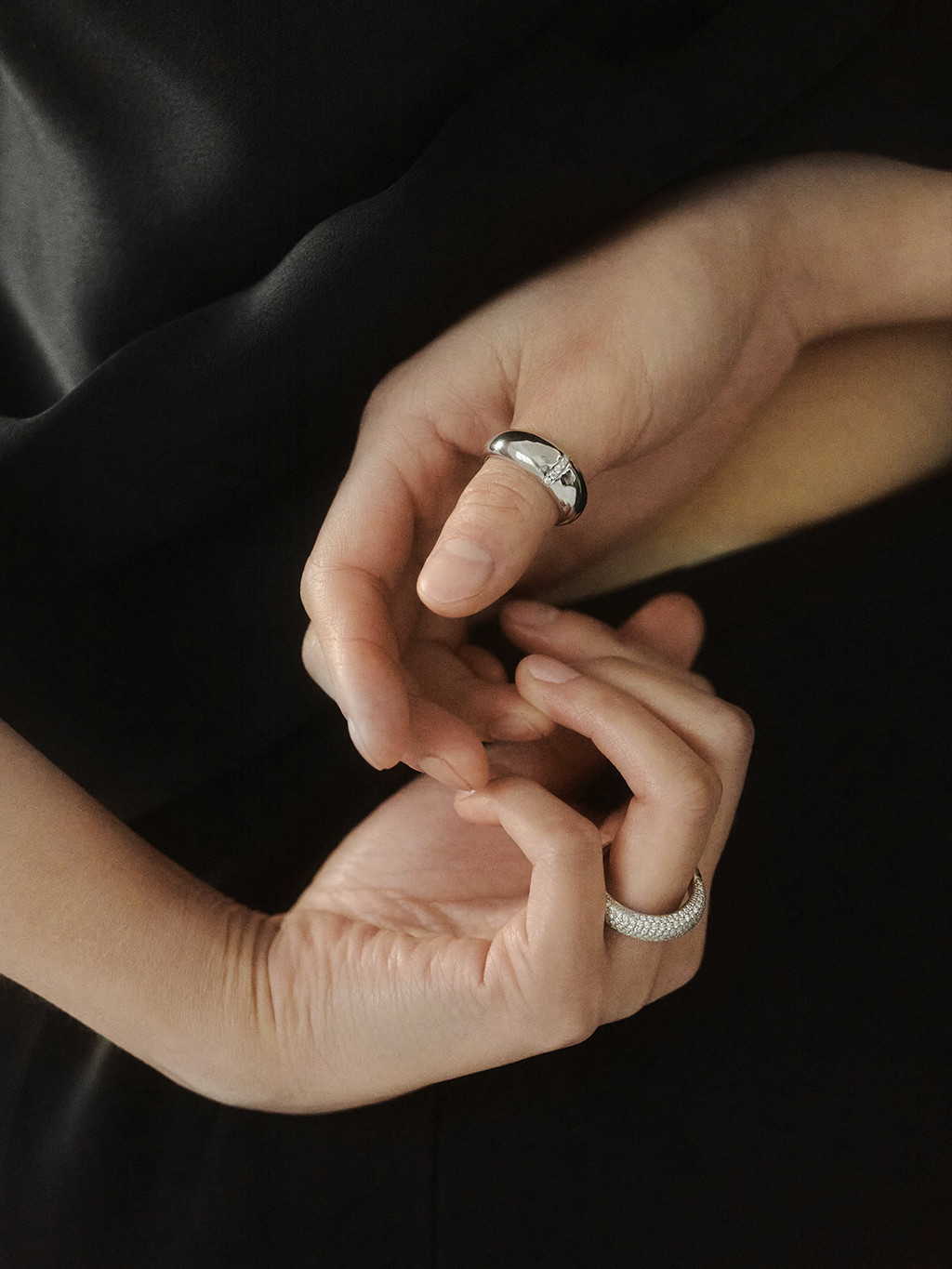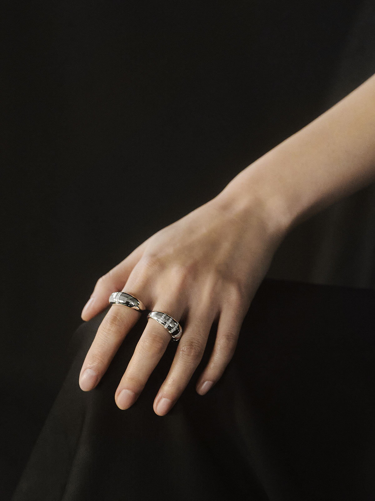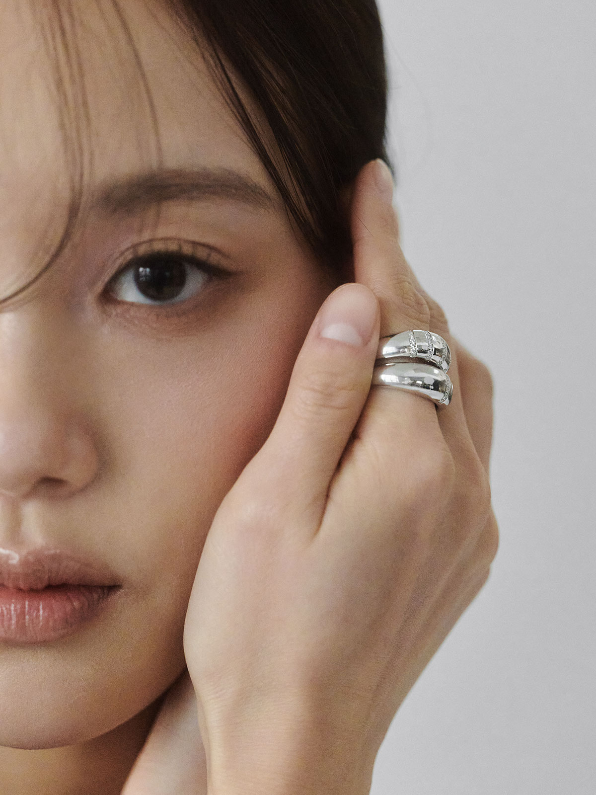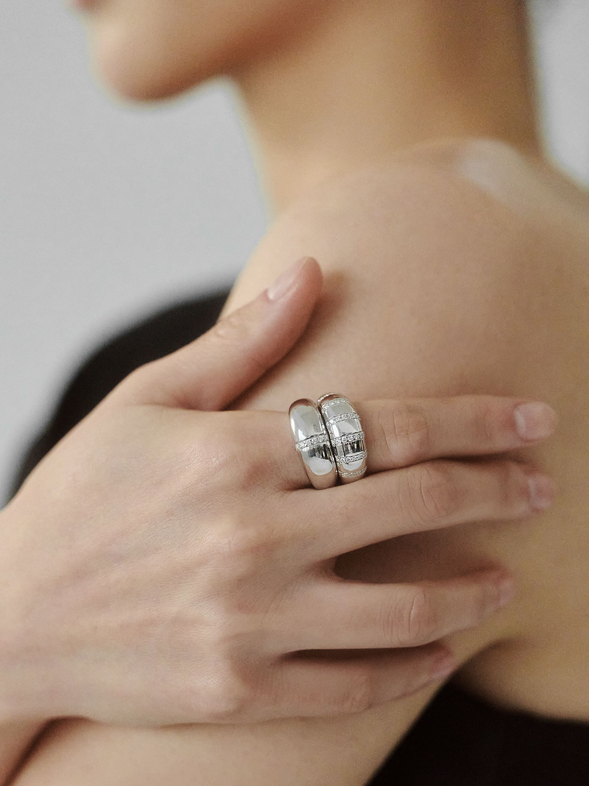 입체적인 곡선 디자인에 자체 제작한 모이사나이트를 세팅한 돔 링입니다. 심플한 디자인에 반짝이는 원석으로 포인트를 더했으며, 적당한 무게감이 주는 안정감과 고급스러운 디테일로 세련된 연출이 가능합니다.